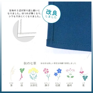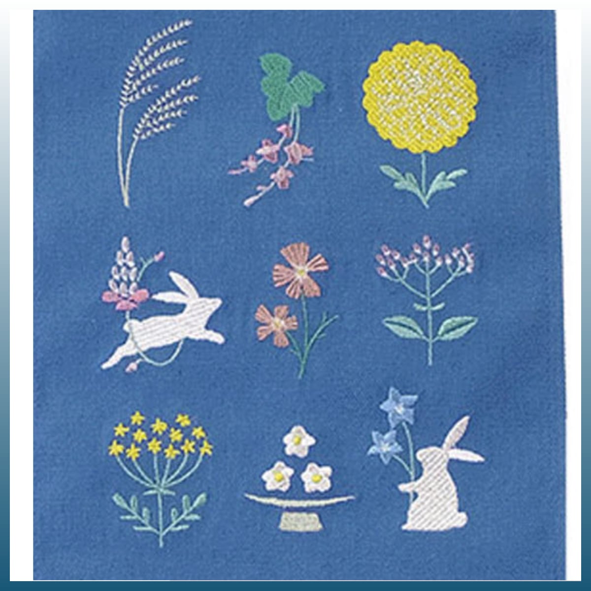 ススキ・キキョウ・もみじ・イチョウ・コスモス・ピンポンマムなどの植物で構成された図案で、お月見団子もお花になっているところがポイントです。