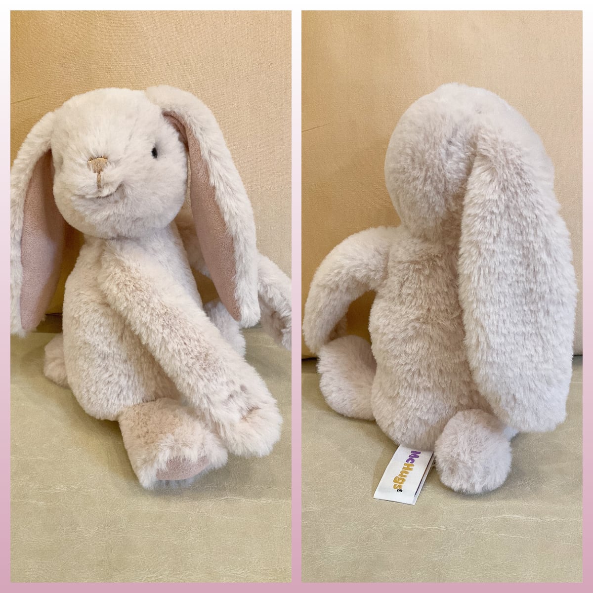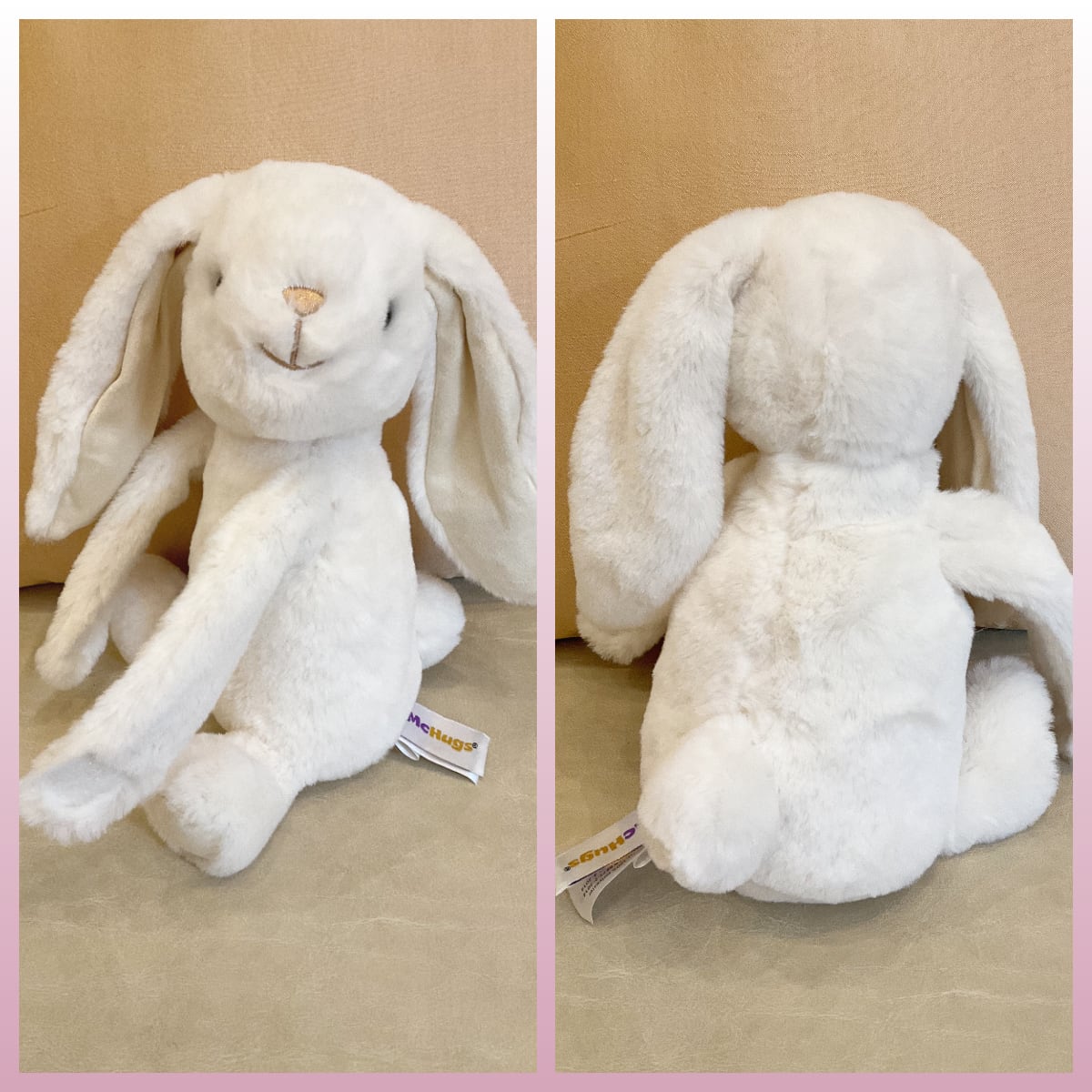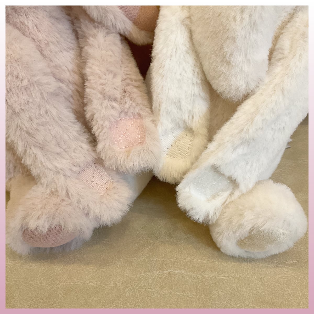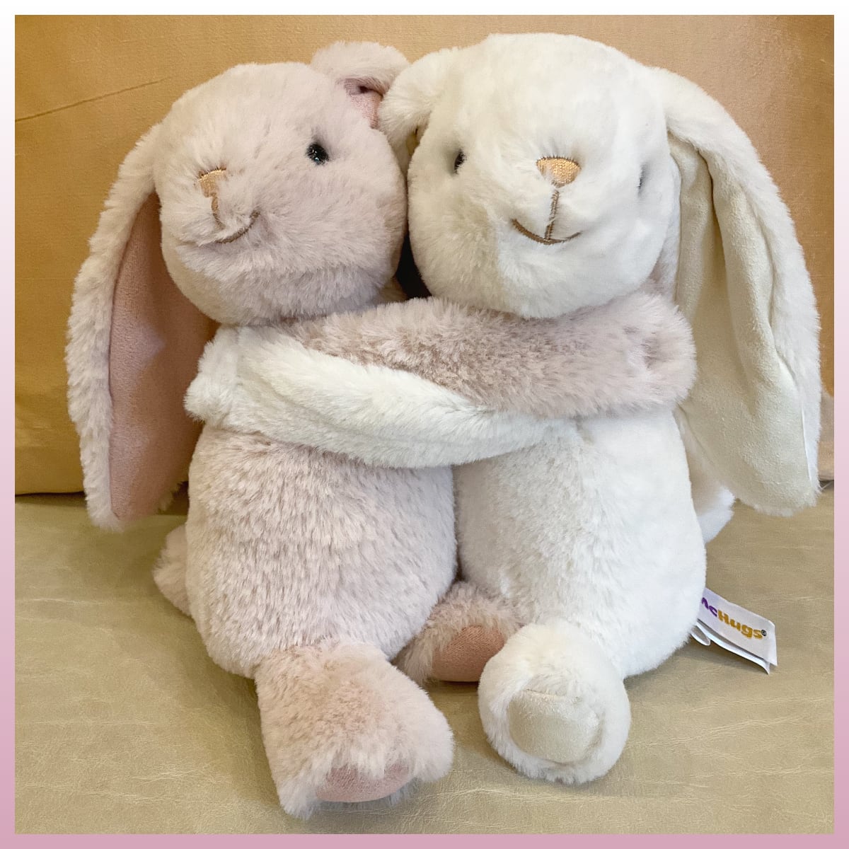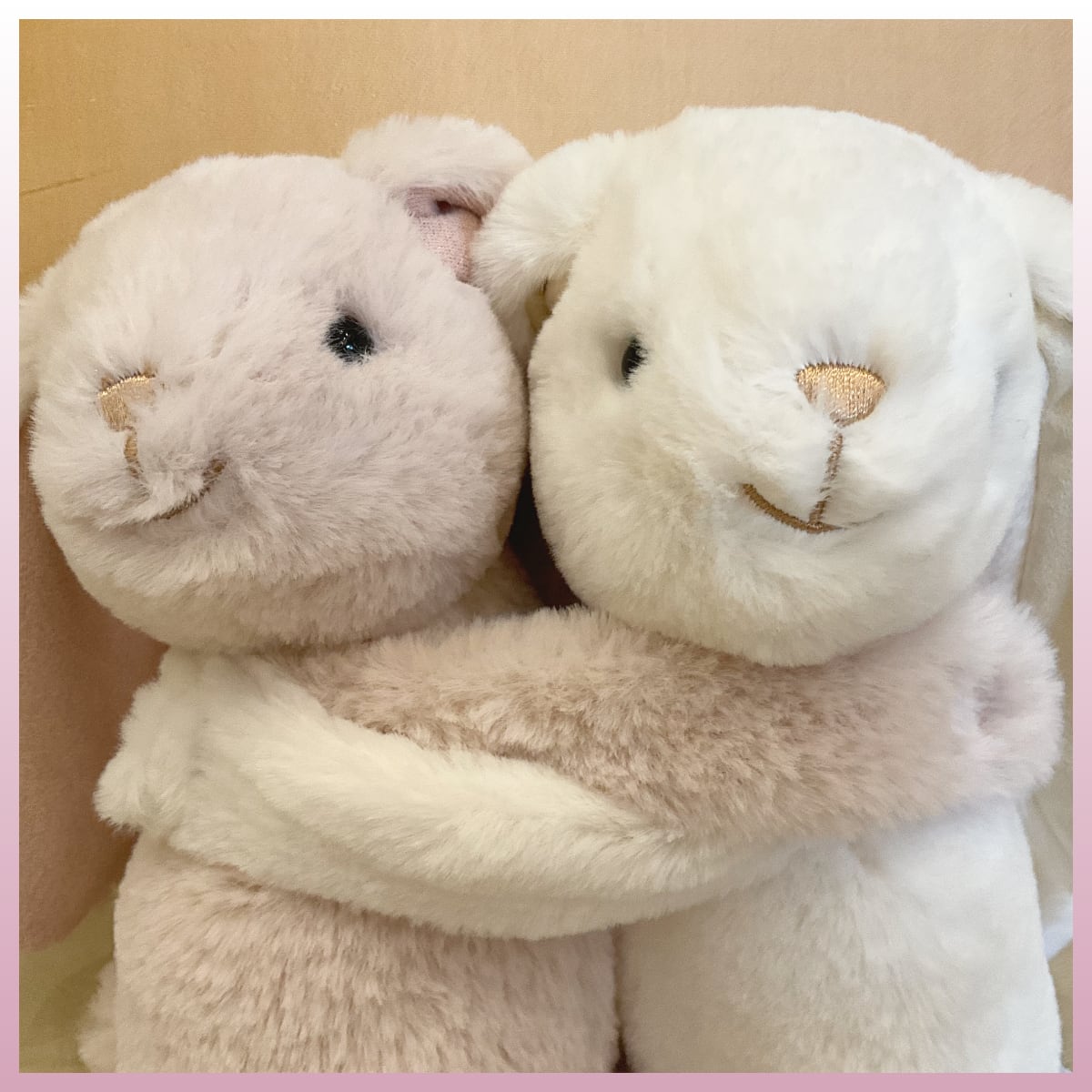 やわらかな手ざわりで、ピンクと白のうさぎがギュッとしている姿が、心がふっとほどけるような癒しに。