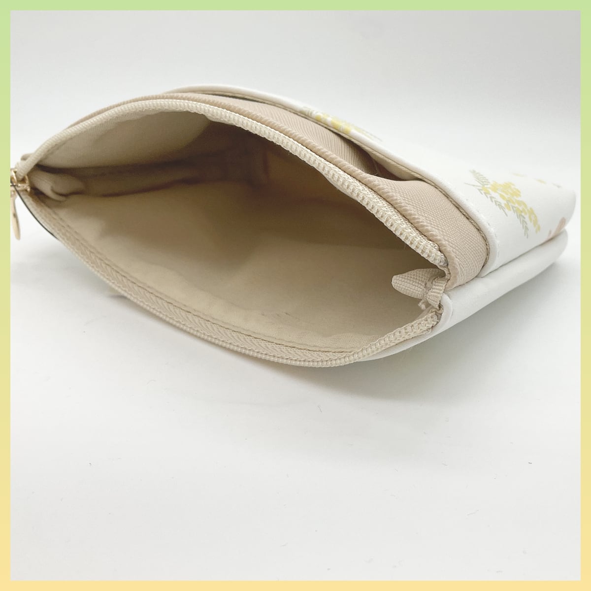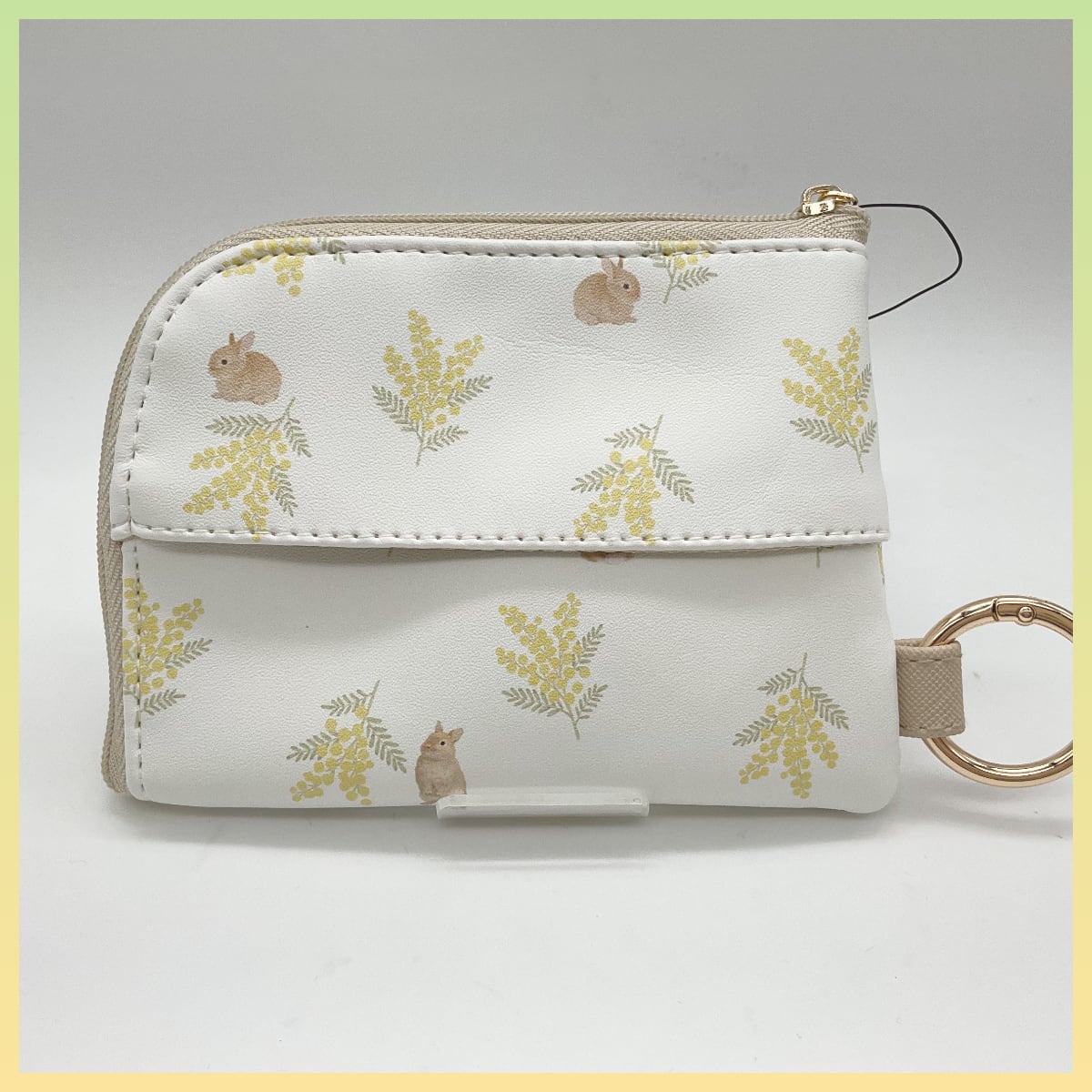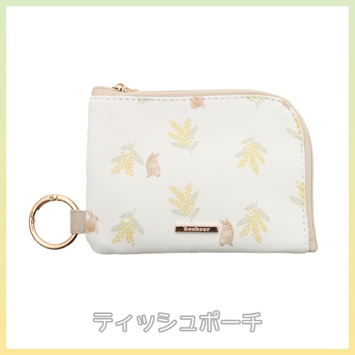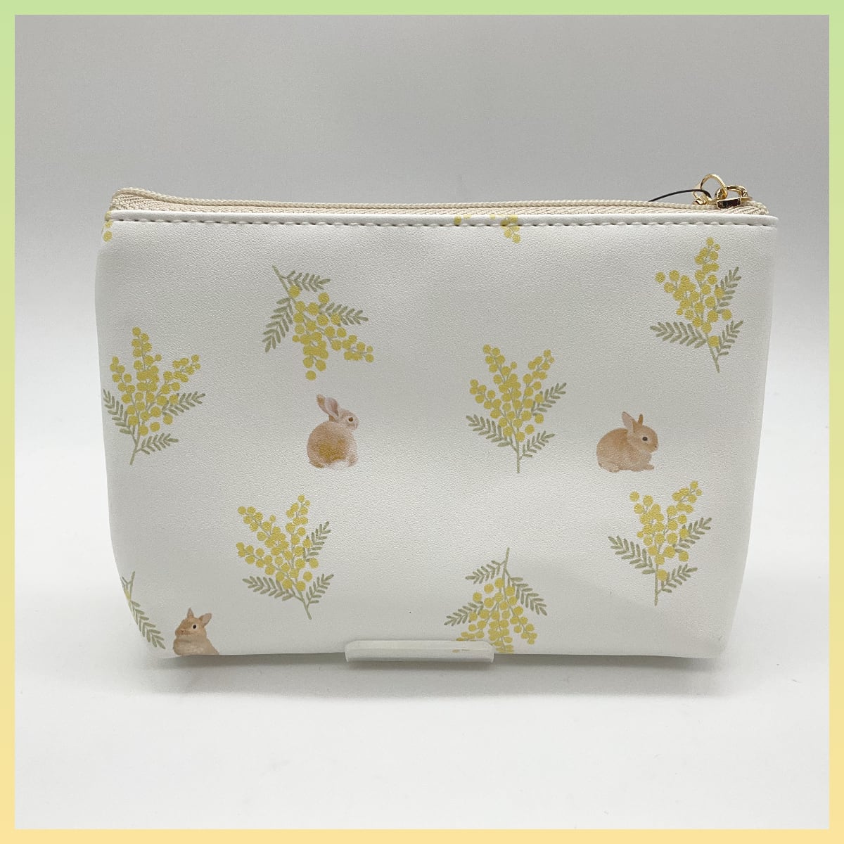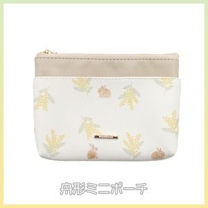 うさぎとミモザがデザインされたポーチ。